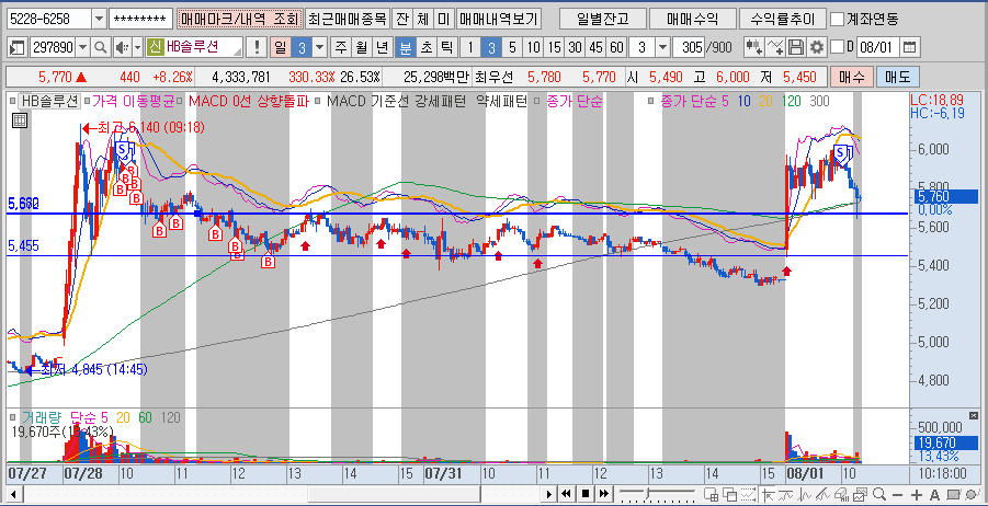 분봉상 7월 28일(금) 매수 후 급락 이후 바로 손절 하지 않고, 2개의 선 5,584원과 5,455 원에 지지 라인이 있을 것으로 판단이 되어 해당 구간에 분할 매수로 계속 매수 하였습니다.